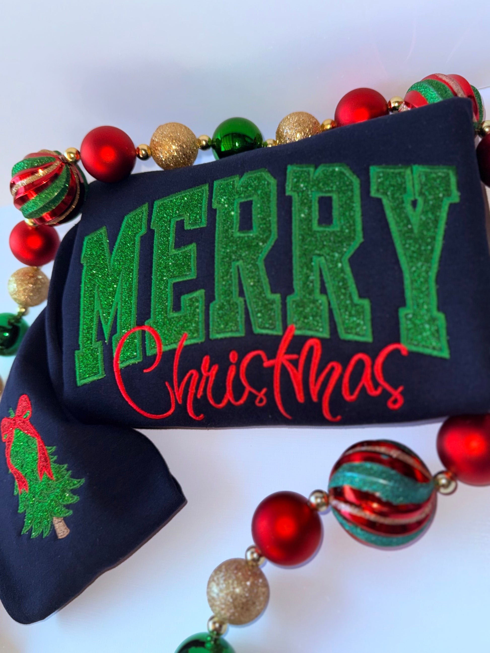 Each sweatshirt or hoodie is customized just for you — featuring bold glitter lettering, embroidered “Christmas” script, and a festive tree sleeve detail topped with a glittery bow.